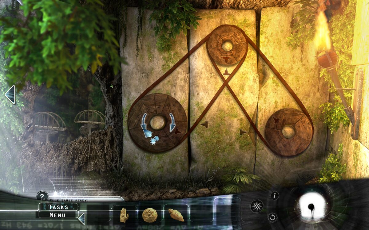 Central to the experience are the easy-to-follow hidden-object sections and light environmental puzzles. Items are collected directly from the scene and stored in the bottom-screen inventory, where they can be dragged and dropped onto hotspot puzzles or combined to unlock new areas. A hint system—represented by an iris icon—gradually recharges, offering gentle guidance to ensure players don’t become frustrated. Meanwhile, the task list with its “?+” clue button keeps objectives clear and aids in maintaining forward momentum.