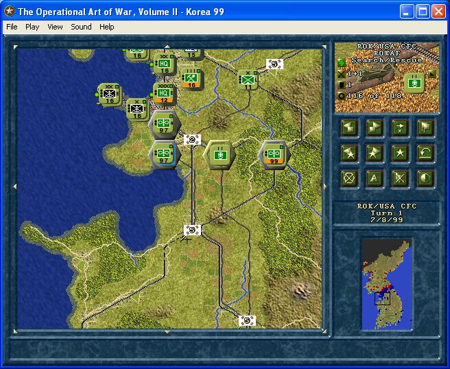Graphically, The Operational Art of War II opts for function over flashy visuals. The map interface is clean and uncluttered, using clear hex-based grids and color-coded terrain to denote forests, urban centers, and elevation changes. While this approach lacks the sheen of modern real-time strategy titles, it makes vital tactical information immediately legible.