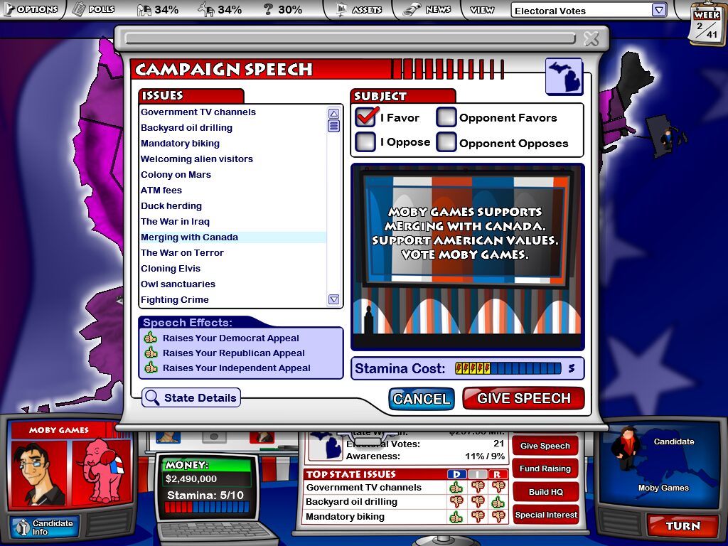 Once the campaign begins, you’ll navigate a 41-week election cycle where timing and resource allocation are paramount. You can visit swing states to give rousing speeches, establish regional campaign headquarters to boost local organization, or jump onto cable TV shows such as “The O’Malley Scenario” and “Hard Hitter” to sway national opinion. Random events, including endorsements from war heroes, Hollywood celebrities, or special-interest groups, add an unpredictable layer that forces you to adapt your strategy on the fly.