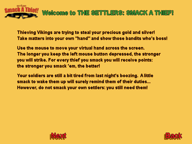 The core of The Settlers: Smack a Thief! revolves around a deceptively simple mechanic: protecting your precious gold and silver from marauding thieves by any means necessary. As thieves attempt to abscond with your treasure, you control an on-screen cursor and punch either the thieves directly or your slumbering guards to rouse them. The more powerful your punch, the longer the thief stays incapacitated, giving your settlers time to retrieve dropped coins and bullion before time runs out.
