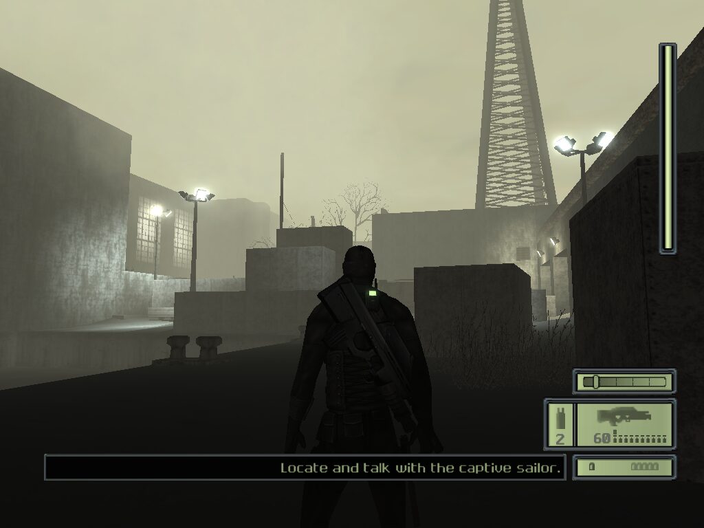 The game’s draw distance and level geometry remain impressive, even today. Vast Georgian compounds and sprawling shipyards create a sense of scale and immersion that few stealth games of that period attempted. Subtle effects like lens flares, flickering fluorescent lights, and rain-soaked metal surfaces enhance the overall ambiance, successfully plunging you into a world where a single misstep can trigger a firefight.