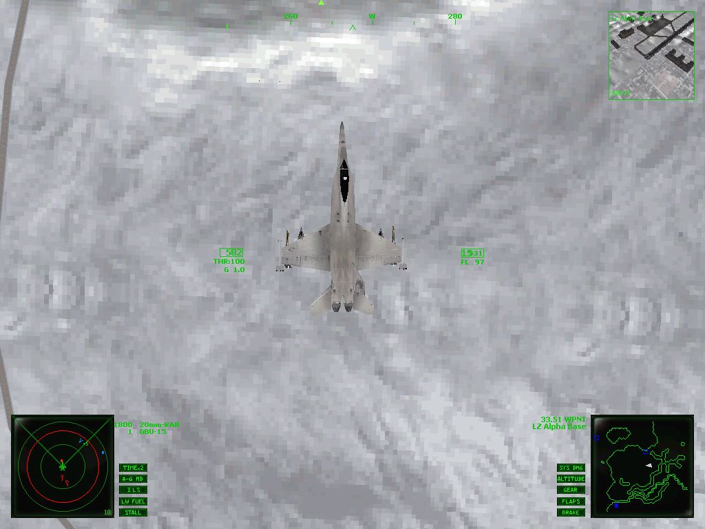 Visually, Top Gun: Hornet’s Nest represents a notable step up from its predecessor. The terrain across the three theaters is distinct and believable: lush canopies and winding rivers in Colombia; stark white vistas and rocky plateaus in Siberia; and vast desert plains dotted with oil rigs in the Persian Gulf. Texture resolution and draw distance are respectable for a late-’90s flight sim, delivering convincing environments that enhance immersion.
