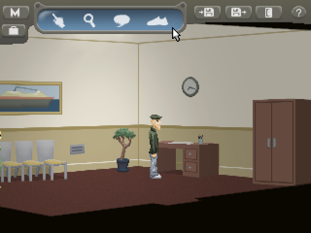 Trance-Pacific embraces the golden age of point-and-click adventures with an interface that will feel instantly familiar to fans of King’s Quest and Leisure Suit Larry. You navigate Vince, Eve, and Nick around the cruise liner using four distinct icons: the hand to manipulate objects, the magnifying glass to inspect every nook and cranny, the speech bubble to converse with NPCs, and the shoe to move between screens. Cycling between these icons with a right‐click keeps the experience fluid, letting you focus on solving puzzles rather than wrestling with controls.