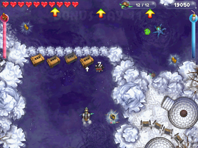 The environments range from sandy beaches dotted with palm trees to rocky outcrops strewn with wooden barrels and TNT crates. Textures are simple but crisp, ensuring that important gameplay elements—like power-ups and frozen turtles—never get lost in the scenery. Animations, from Kröt’s rocket thrust to the octopuses writhing into cocoons, are fluid and well-timed, enhancing the sense of urgency when a race against hatching begins.
