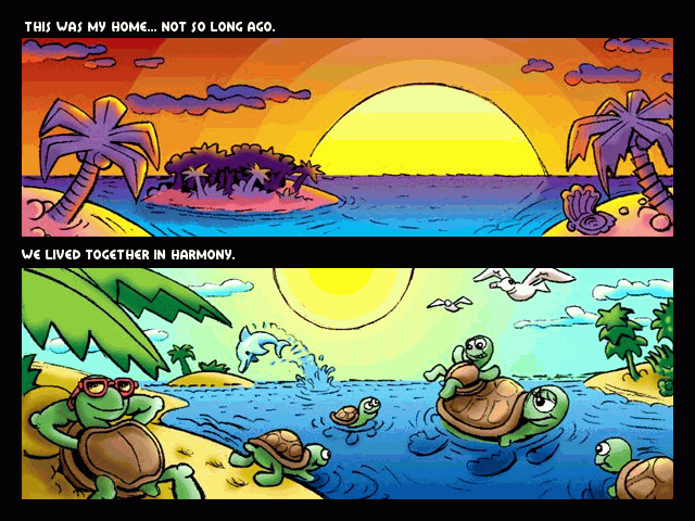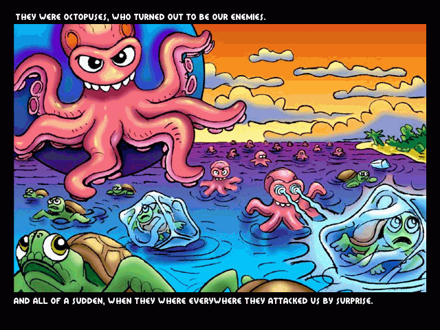 At its heart, Turtle Bay offers a simple but engaging premise: mutant octopuses from outer space have invaded the once-tranquil bay, freezing its turtle inhabitants in cryogenic slumber. Enter Kröt, a courageous member of the Moorhuhn family, determined to set things right. While there’s no deep narrative arc or branching dialogue, the story is conveyed effectively through short cutscenes and playful in-game text.