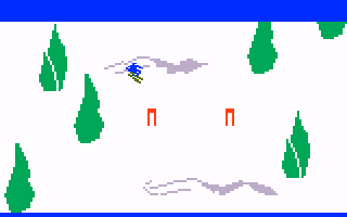 Visually, U.S. Ski Team Skiing embraces a classic, 8-bit charm reminiscent of early arcade titles. The snowy terrain is rendered in simple shades of white and blue, while trees and moguls are represented by distinct pixel clusters that stand out crisply against the background. Though not cutting-edge by modern standards, the visuals retain a nostalgic appeal that will resonate with fans of retro sports games.