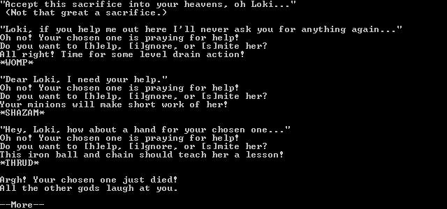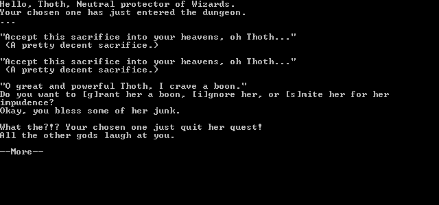 The limited interface—modeled after classic NetHack variants—means most of your time is spent reacting to events rather than orchestrating every swing of the sword. This creates a surprising amount of emergent drama: will you punish cowardice when your champion flees from a horde of orcs? Will you lavish them with power at the first altar or wait until they truly deserve a miracle? Such choices tie your fate to that of a simulated mortal whose personality and perseverance are entirely out of your hands.