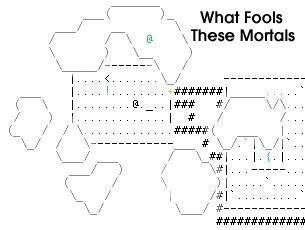 Visually, What Fools These Mortals embraces a retro aesthetic that fans of early ASCII roguelikes will find charming. The interface uses simple character glyphs to represent walls, monsters, and items, augmented by a basic color palette that highlights threats in red and treasures in gold. While there are no hand-drawn sprites or 3D environments, the minimalist approach focuses your attention on strategy and emergent storytelling rather than flashy eye candy.