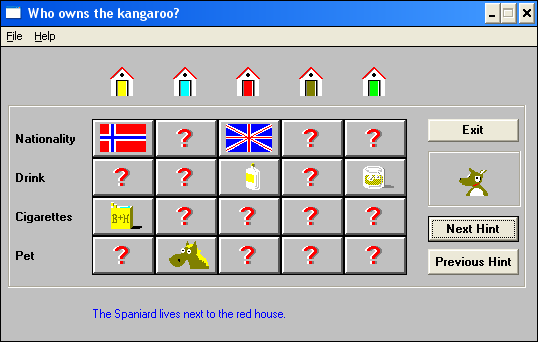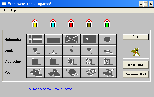 Visually, Who Owns the Kangaroo? opts for a clean, minimalist style that emphasizes clarity over spectacle. Each house is vividly colored—red, green, yellow, blue, and white—making it immediately apparent which house you’re working on. The icons for drinks, cigarettes, and pets are simple yet distinct, reducing any chance of misclicks or confusion.
