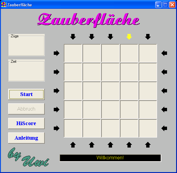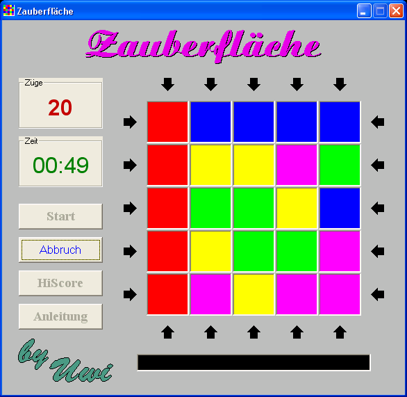 Zauberfläche centers around a deceptively simple 5×5 playfield filled with five squares of five different colors. At the start of each puzzle, the grid is randomized, challenging you to identify patterns and plan your next move. On each side of the grid sits an arrow that shifts the entire row or column one square in the chosen direction. Thanks to the toroidal wrap-around—pushing a row left brings it back in from the right, and similarly for top and bottom moves—new strategic layers emerge as you juggle colors across both axes.
