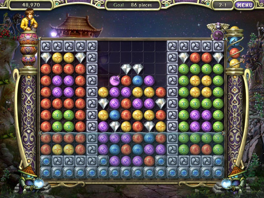 Power-ups and special objects elevate the gameplay beyond match-three basics. Jewels crack or shatter depending on how far they fall, boxed spheres remain immobile until freed by a match, and fireballs can blast through stony blocks (though they leave standard jewels untouched). There are also curved-arrow balls that shove entire lines of spheres, ColorBursts that transform neighboring balls, and Energy Balls which sweep out every matching element in their column. This varied toolkit keeps each level feeling fresh and encourages players to adapt their shot selection on the fly.