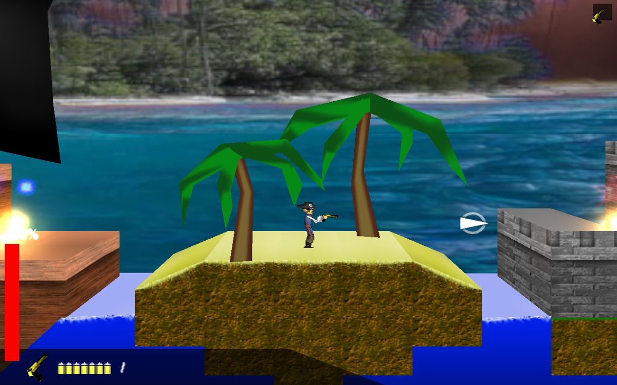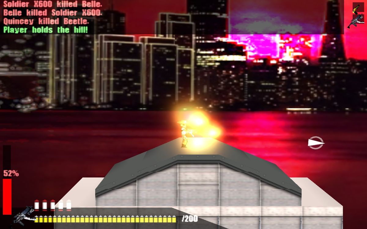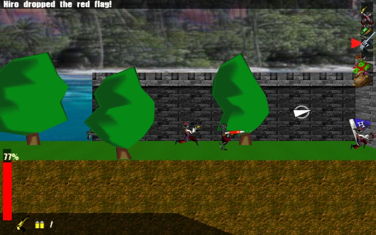 Map design is equally commendable, offering five distinct arenas that balance openness with tight corridors. The three Capture the Flag maps emphasize verticality, using ledges and overhangs to create tactical vantage points, while the two Deathmatch arenas focus on more direct combat corridors. The single King of the Hill map provides a multi-tiered platform structure that rewards quick reflexes and map awareness. Textures and background art are simple but effective, ensuring that visual clarity never suffers even when multiple projectiles fill the screen.