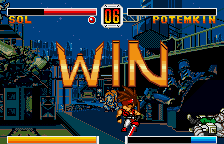 Visually, Guilty Gear Petit embraces a super-deformed (chibi) art style that contrasts sharply with the series’ usual detailed sprites. Characters sport oversized heads and expressive faces, lending a playful charm to the brutal combat. Backgrounds are simplified but vibrant, ensuring fights remain legible on smaller screens while maintaining the Guilty Gear universe’s distinct flair.