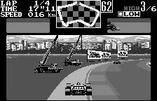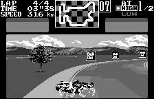 The open-wheel car is rendered with simple, well-defined sprites that communicate your position and orientation at a glance. HUD elements—such as lap count, position, and time—occupy minimal screen real estate, leaving maximum space for the track itself. Even at full tilt, the frame rate remains steady, with only occasional screen flicker when navigating particularly tight sequences.