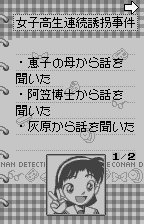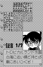 Given the limitations of the WonderSwan hardware, Meitantei Conan delivers surprisingly detailed pixel art. Character sprites are crisp and immediately recognizable from the anime, with Conan, Ran, Ai Haibara, and the Junior Detective League members rendered in charming, expressive form. Portraits during conversations emphasize subtle facial expressions, adding emotional weight to witness testimonies.