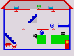 The first level serves as a perfect introduction to the game’s mechanics. You begin in a rumpled bed, and the simple act of getting up turns into a micro-puzzle: careful positioning to avoid the swinging blanket, followed by a measured dash to the wardrobe. Retrieving your suit from the cupboard is made delightfully tense by the need to dodge a Spectrum computer perched on a low shelf, forcing you to time every step just right.