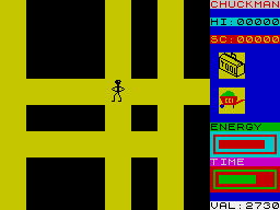 Chuckman’s gameplay strikes a fine balance between puzzle-solving and adrenaline-fueled action. You control a bomb disposal expert navigating through a sprawling 60-screen maze, each corridor marked by striking yellow paths. The core objective on every level is to neutralize eight bombs by first locating the correct toolkit—an item that must be carried one at a time, forcing you to plan multi-stage routes through the maze.
