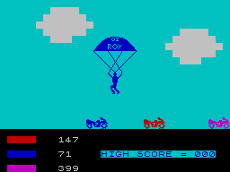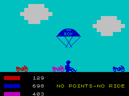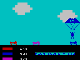 Rider delivers a two-stage challenge that keeps players engaged from drop to finish line. In the first phase, you assume the role of an MI5 agent parachuting into enemy territory. You must time your descent precisely to land on a passing motorcycle, balancing left and right movements to align with one of three color-coded bikes that scroll across the screen at unpredictable intervals. Each bike carries a distinct points value, and the randomized appearance of these bikes adds an element of tension and spontaneity to every attempt.