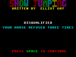 Once on the field, the horse is presented in a side-view format, and you must rotate its stance by pressing left or right—each press turns the horse by 30 degrees. This simple control scheme places emphasis on timing and spatial awareness: misjudge your angle by even a hair, and you risk grazing a hurdle. Successfully clearing fences requires split-second coordination of rotation and jump commands within the 100-second time limit.