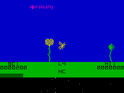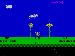 The Birds and the Bees places you in control of Boris the Bee, whose sole mission is to harvest as much nectar as possible from sprawling fields of flowers. Viewed from a side-scrolling perspective, each level is a colorful tapestry of blossoms that disappear when you collect their nectar, directly contributing to your score. This simple collect-and-deposit loop is remarkably engaging, as you constantly weigh the risk of venturing deeper into hostile territory against the reward of richer nectar patches.