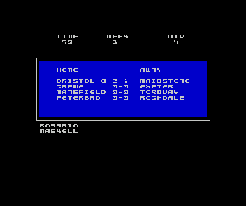 Matchdays are represented by a live scoreboard grid displaying every game in the division simultaneously. When a goal is scored in your match, the border around the scoreboard flashes as an alert. There is no 2D or 3D animation of the action—substitutions occur at half-time via a popup menu—so all drama unfolds through changing numbers rather than cinematic sequences.