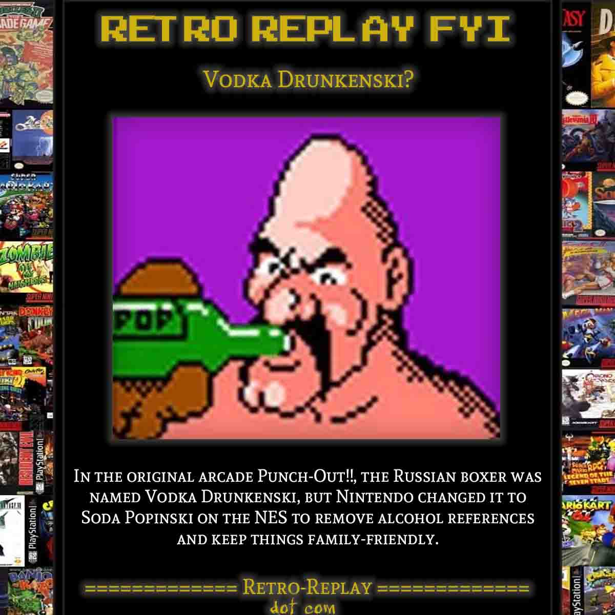But when Punch-Out!! was brought to the NES, Nintendo of America made a key change: the name was changed to Soda Popinski, and the alcoholic references were toned way down. The soda bottle replaced the vodka, and the character gradually took on a more family-friendly (if still absurd) identity. Wikipedia